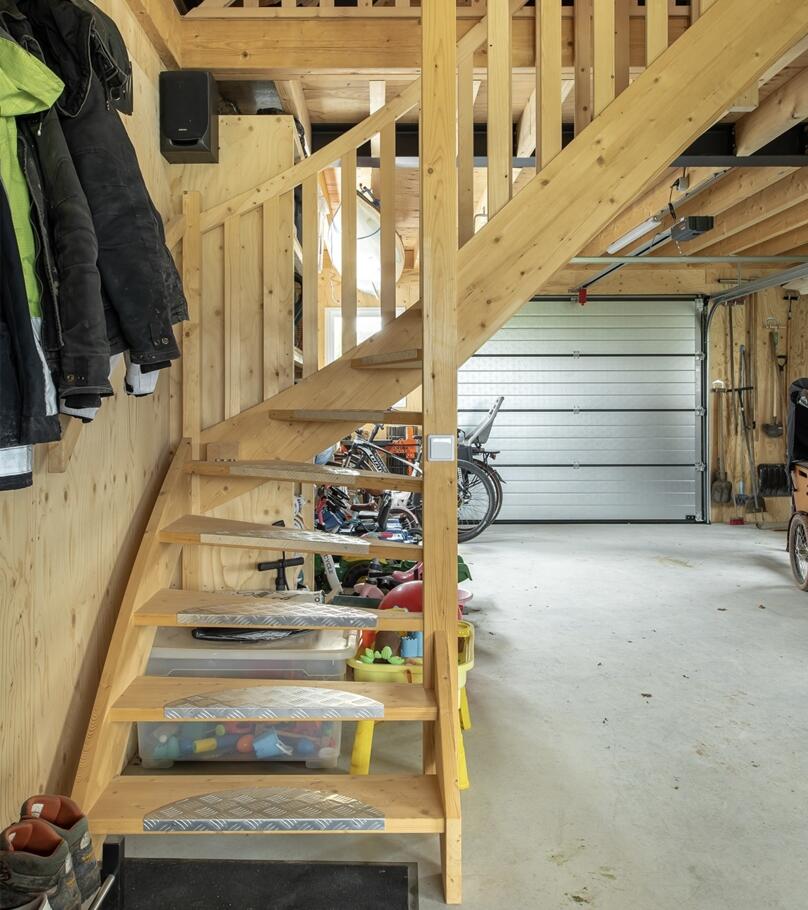 Maak een afspraakGeen constructie in het zicht maar wel sterk genoeg om alles te dragen. Door middel van meerdere stalen spanten kan het dak daardoor gedragen worden en is er een verlaagde zolder mogelijk. De planken worden onderbroken door Douglas balken om zo geen kieren te krijgen bij de aansluiting van de wanden. De antraciet kleur geeft het een lichtere uitstraling en komt mooi overeen met de sectionaaldeur. In de garage bevind zich een vaste draaitrap en zijn er stalen liggers toegepast om de overspanning op te vangen.