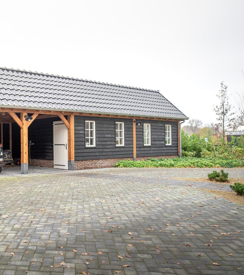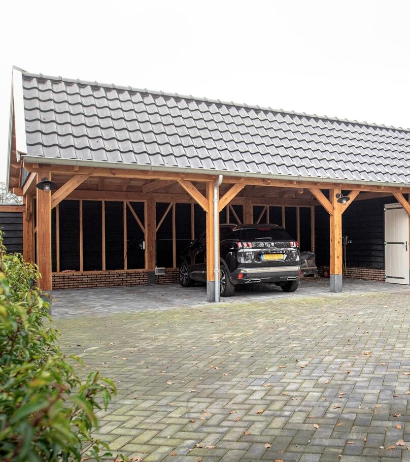 In Huissen hebben onze vakmannen deze prachtige Kapschuur met carport gerealiseerd. De buitenzijde is gemaakt van Douglas hout en op het dak is gebruik gemaakt van keramische pannen. De lichte stenen met donkere voeg geven een leuk contrast. Er zijn ramen toegepast met 6 vaks roedeverdeling. Achterzijde van de kapschuur net zo hoog als voorzijde voor optimaal ruimtegebruik.